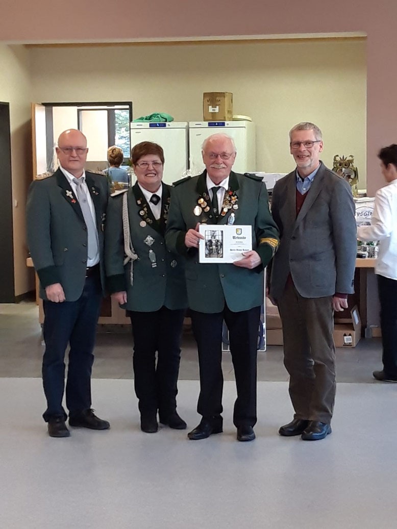 Herr Klaus Kinner wurde für 25 Jahre Mitgliedschaft mit dem Jubelorden und einer Urkunde geehrt am 21.01.2018 auf dem Bild . Brudermeister,Jürgen Schäfer, Brudermeisterin Marga Kinner, Jubilar Klaus Kinner und Präses Pastor Apelt